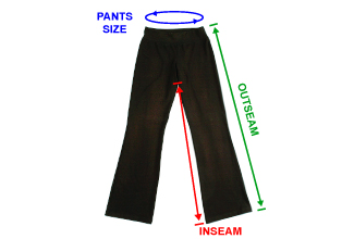 OUTSEAM: Measure along the outer edge of the garment. Start at the top of the waistband and end at the bottom hem.