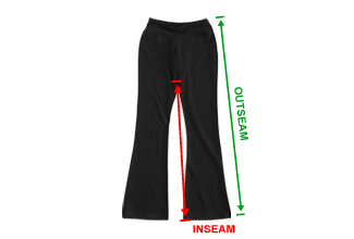 OUTSEAM: Measure along the outer edge of the garment. Start at the top of the waistband and end at the bottom hem.