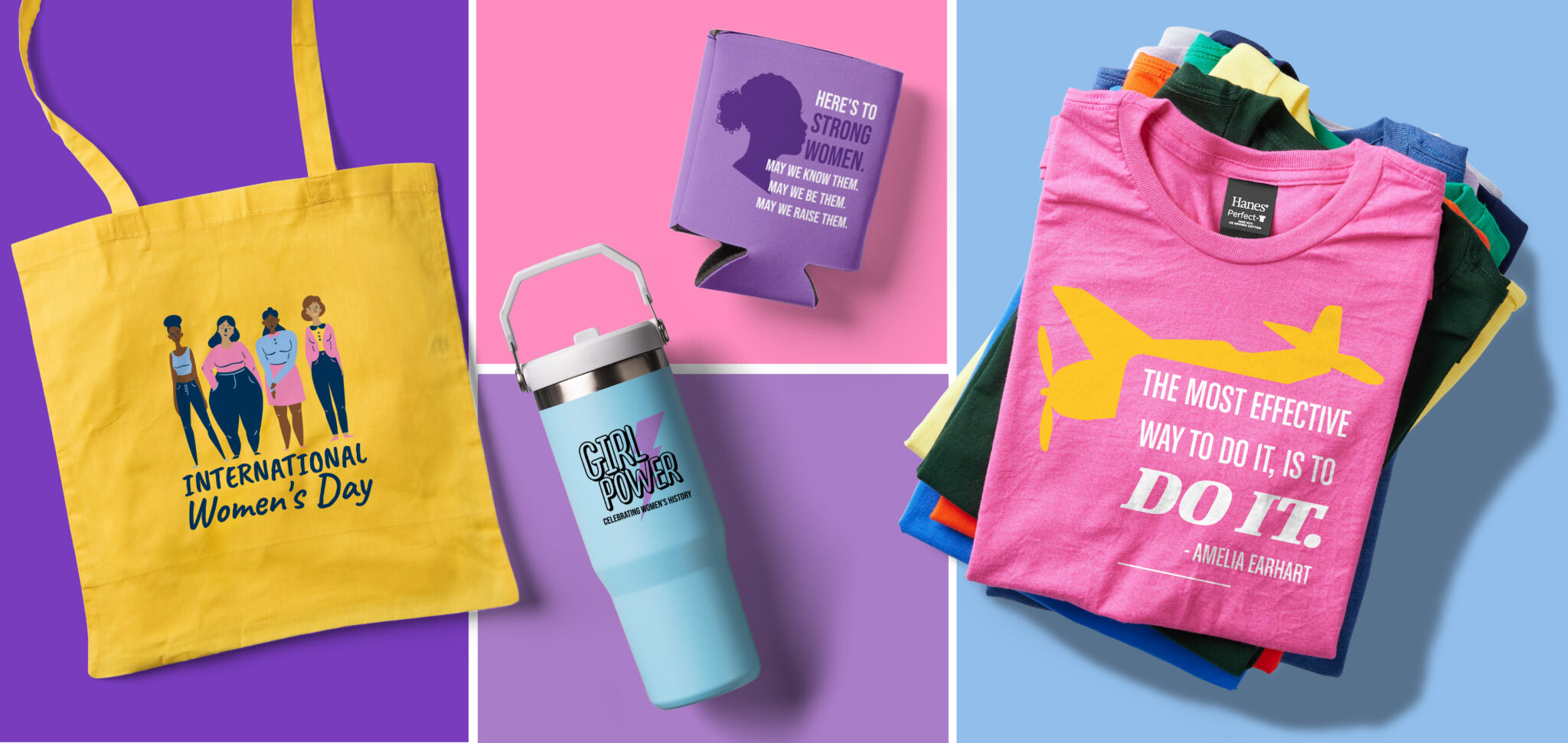 A collage displaying various custom products with motivation quotes for women printed on them, including a yellow tote bag, a baby blue stainless steel tumbler, a lavender Koozie, and a stack of custom t-shirts.