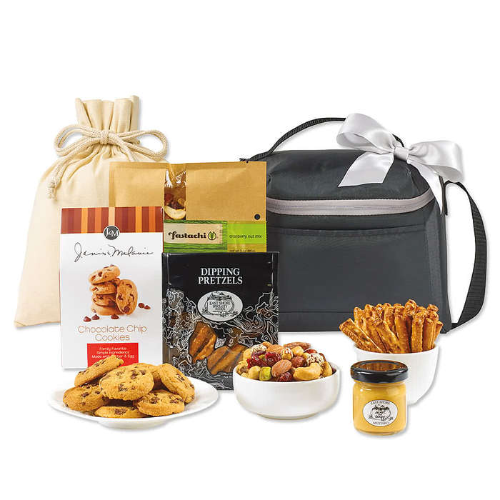 Treat your team members and clients to a delicious picnic that they can enjoy with coworkers, family, and friends. The cooler has a 7-can capacity and can be used for work lunches, beach days, movies in the park, tailgating, and so much more. Snack on chocolate chip cookies, dipping pretzels, sweet ‘n’ tangy mustard, and a berry nut mix to satisfy all your cravings.
