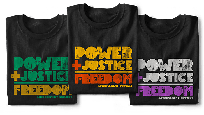 AP:  One of our internal mantras at Advancement Project is that if we aren’t building power, we aren’t doing it right. It’s our special sauce. In thinking about the t-shirt design, we wanted something that we could see people wearing to an action, something that amplified our demands for freedom for Black and Brown communities. For us, Justice and Power aren’t just buzz words, they are in the actual names of our programs. Demanding Power and Justice are essential to achieving our end goal of Freedom for communities of color.