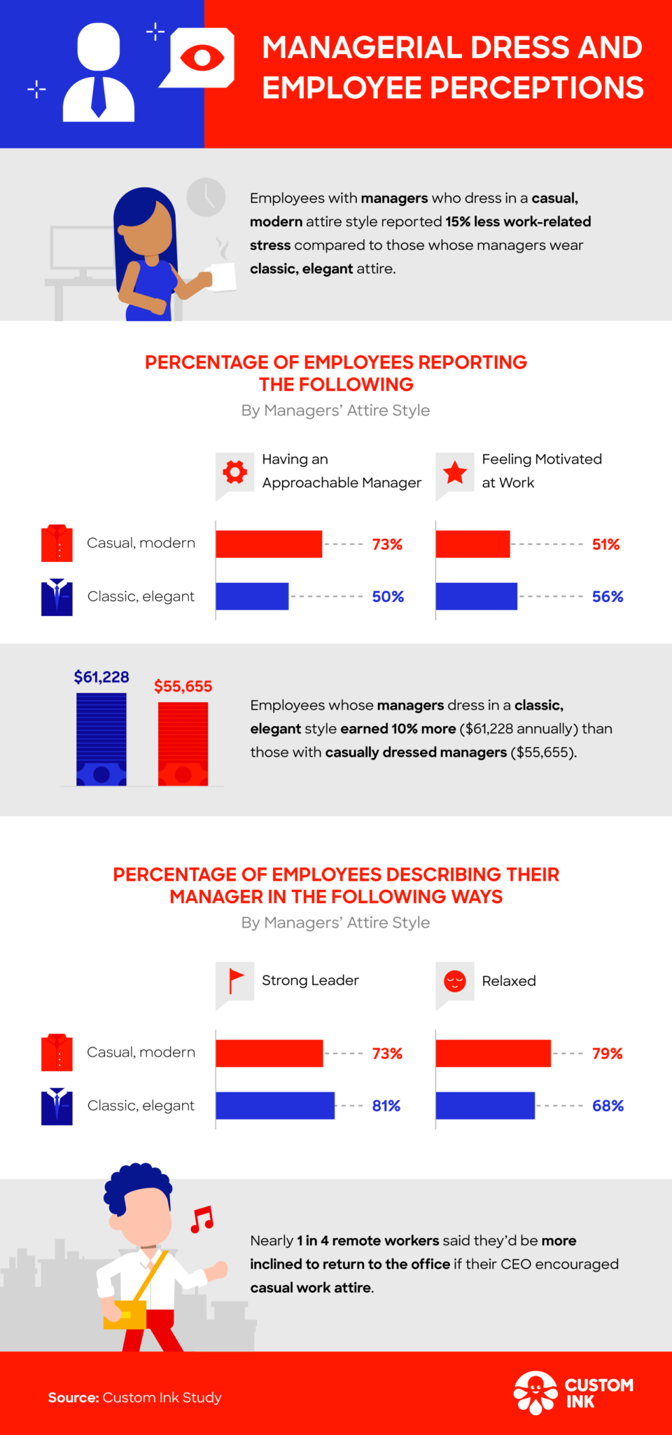 - Employees whose managers dress in a classic, elegant style earn 10% more than those with casually dressed managers ($61,228 and $55,655, respectively).