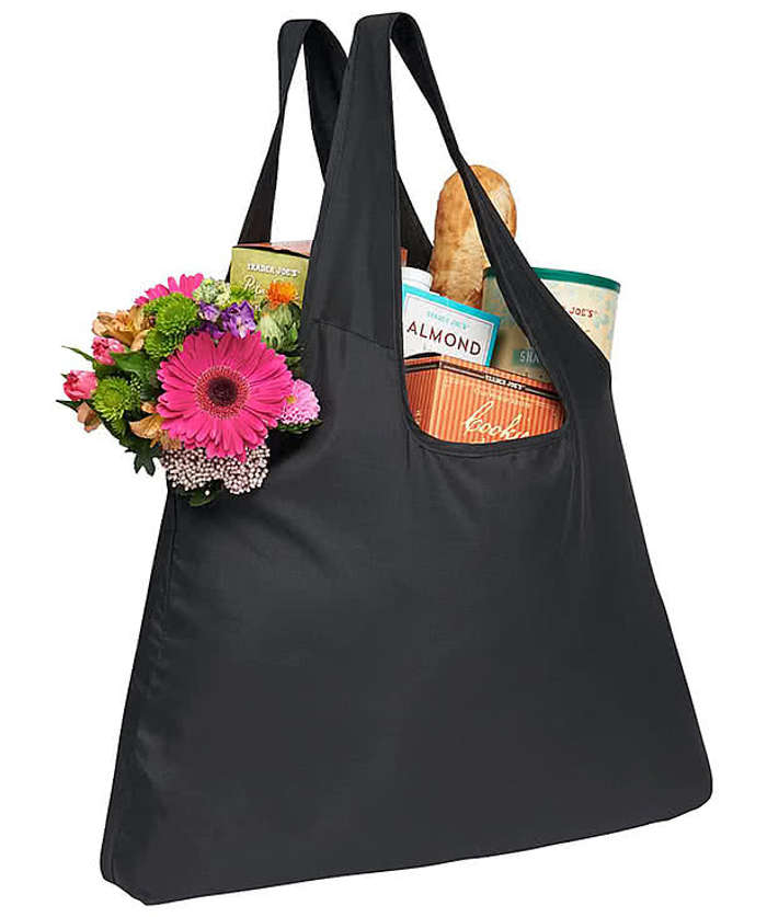 - Features: Folds into integrated sewn-in pouch; reinforced handles; large imprint area