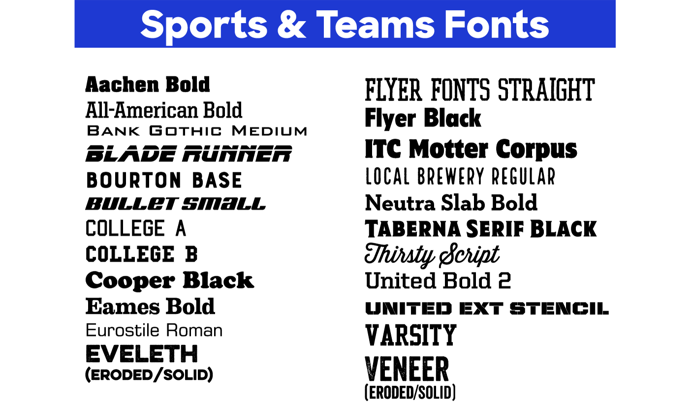 Choosing the right fonts for your custom sports gear can really help you knock it out of the park. Whether you need jerseys, team t-shirts, jackets, hats, or more, we’ve narrowed down our favorite fonts for your sports team and apparel. The graphic below features some of our favorite sports templates that use these fonts.