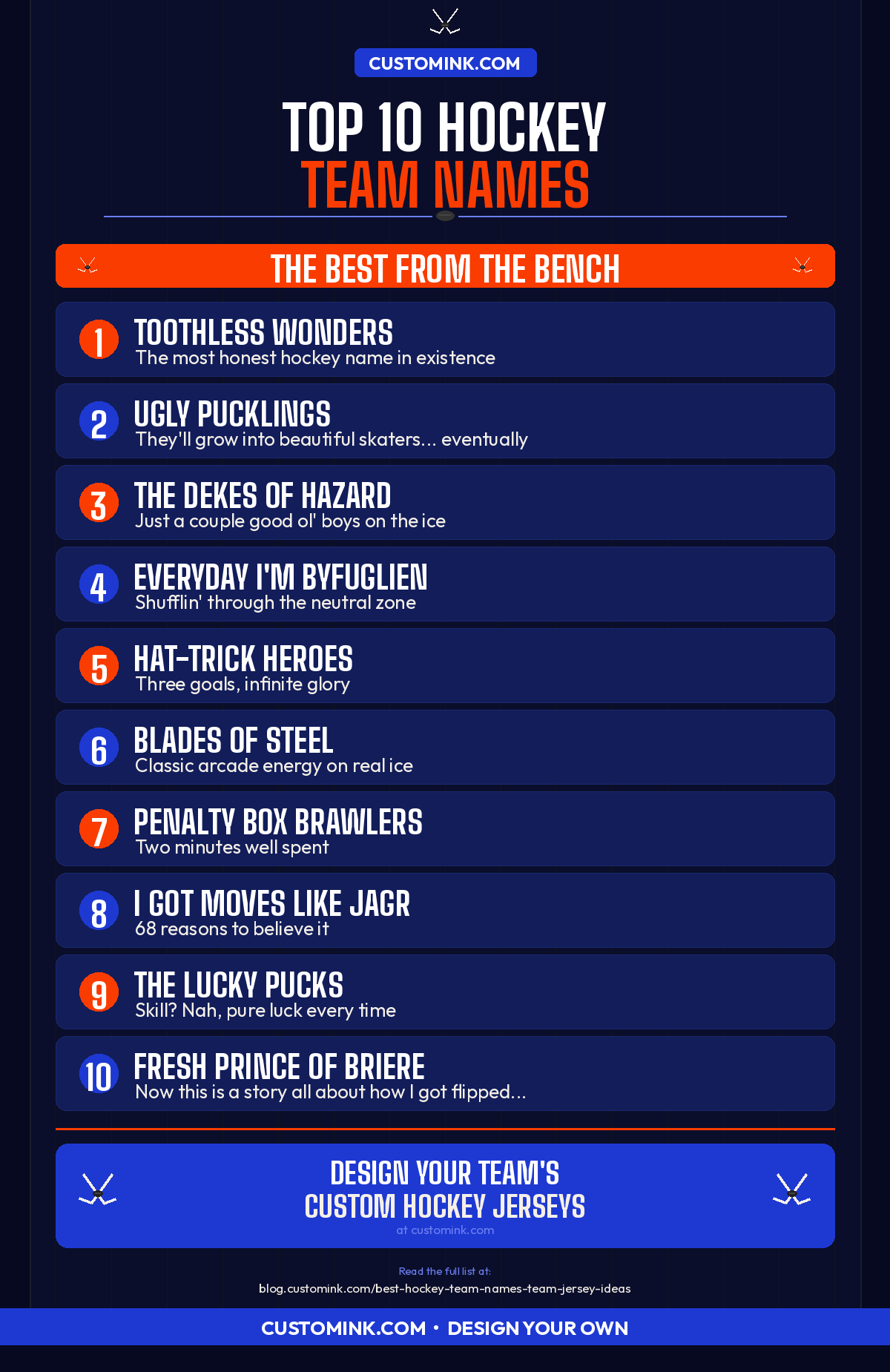 If you’re looking for a fun name for your hockey team, take a look at this list that we’ve curated from our fav hockey team customers from over the years. And if you’re looking for gear for your team, check out our team jerseys and apparel.