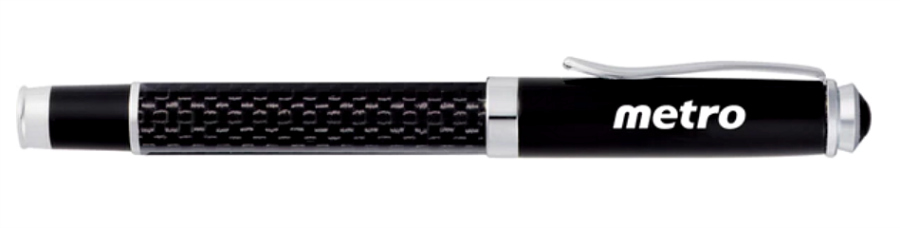 The Luna Roller Ball will be a staple in your writing repertoire. It has a cap off design with a gloss black enamel upper barrel, and carbon fiber detailing on the lower barrel. It has stand-out chrome accents along with black ink. We love the sleek design of this pen and how your logo on the cap will stand out for any event or at your office.