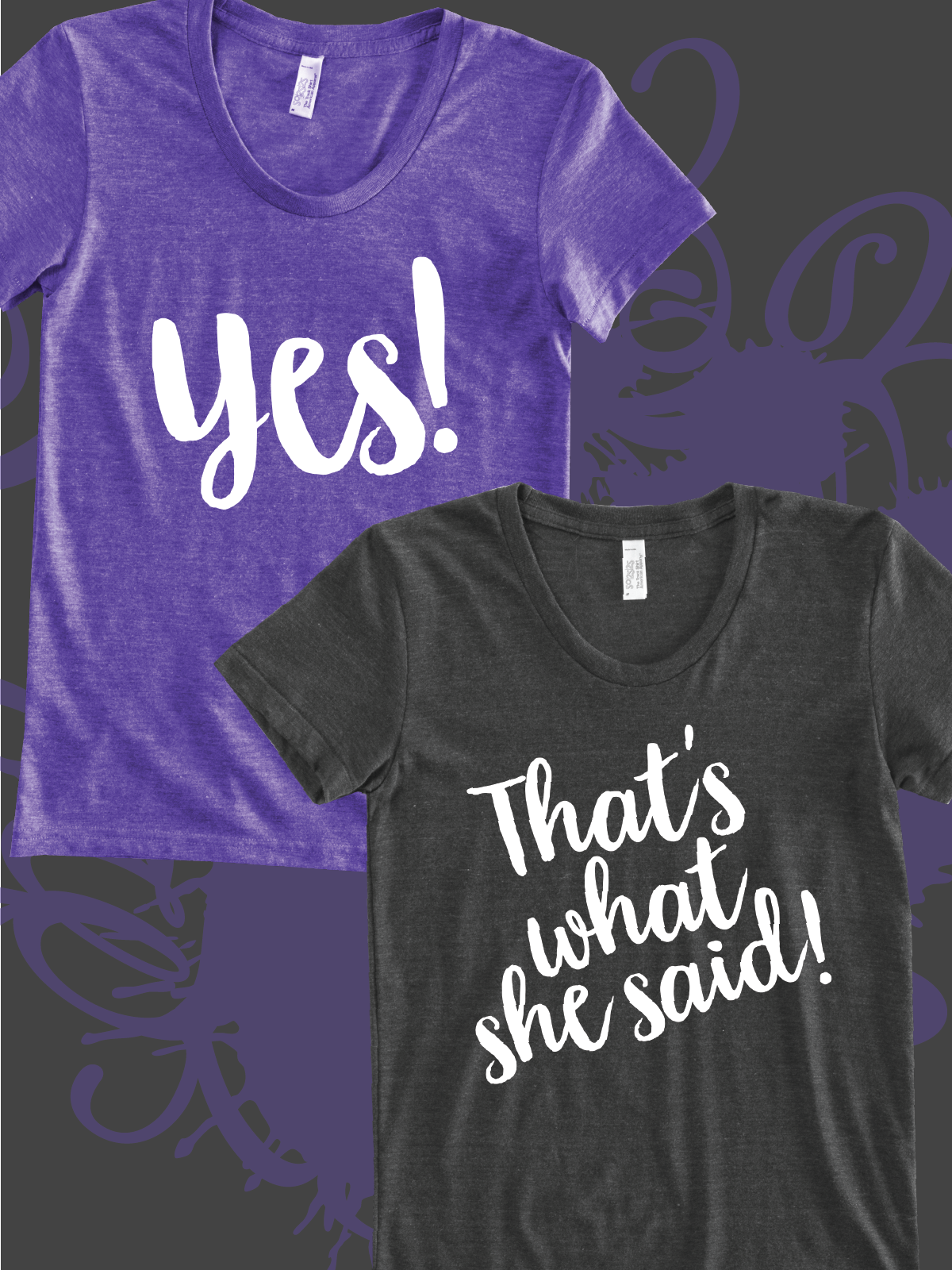 Custom tees for your group doesn’t mean that everyone’s in the exact same shirt- let the bride shine with her own standout design! Anything in our no minimum section can be ordered in quantities as small as one, and includes over 50 trendy styles that she is sure to say YES! to.