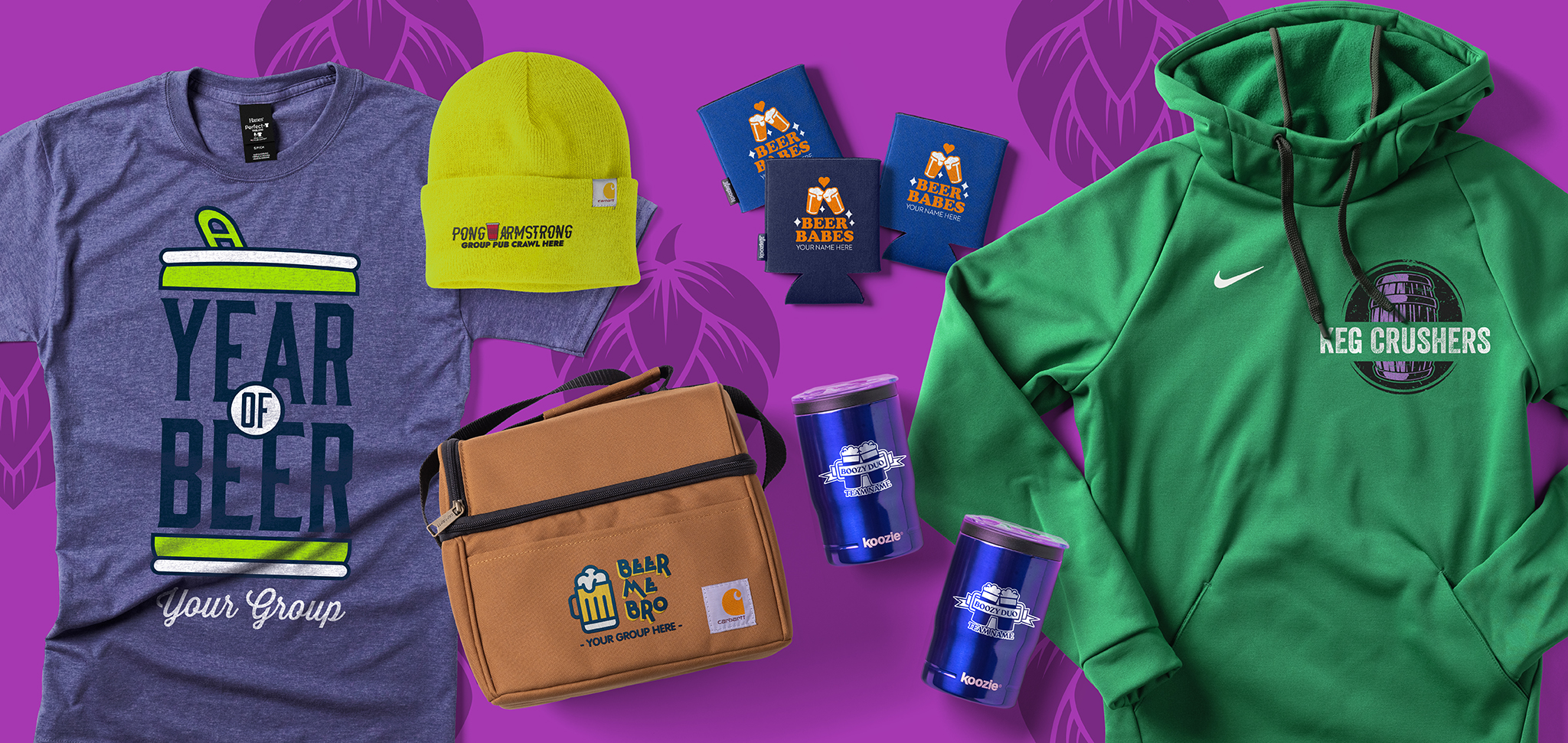 A graphic showing various custom apparel and accessories for the beer Olympics: a t-shirt that reads “Year of Beer / Your Group”; a Carhartt beanie that reads “Pong Armstrong / Group Pub Crawl Here”; a Carhartt can cooler that reads “Beer Me, Bro / Your Group Here”; three can Koozies® that read “Beer Babes / Your Name Here”; two Koozie® insulated tumblers that read “Boozy Duo / Team Name”; and a Nike hoodie that reads “Keg Crushers.”