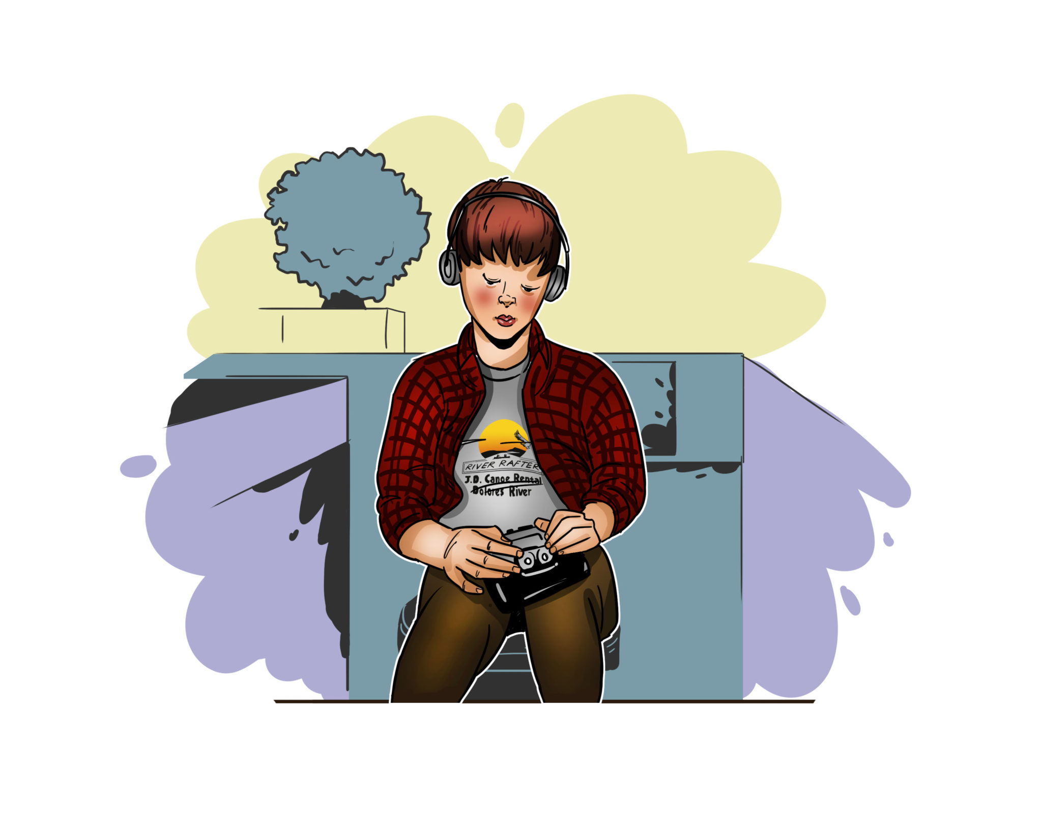 We only see this shirt for a second or two, but it appears to be the faceplate of a retro radio.