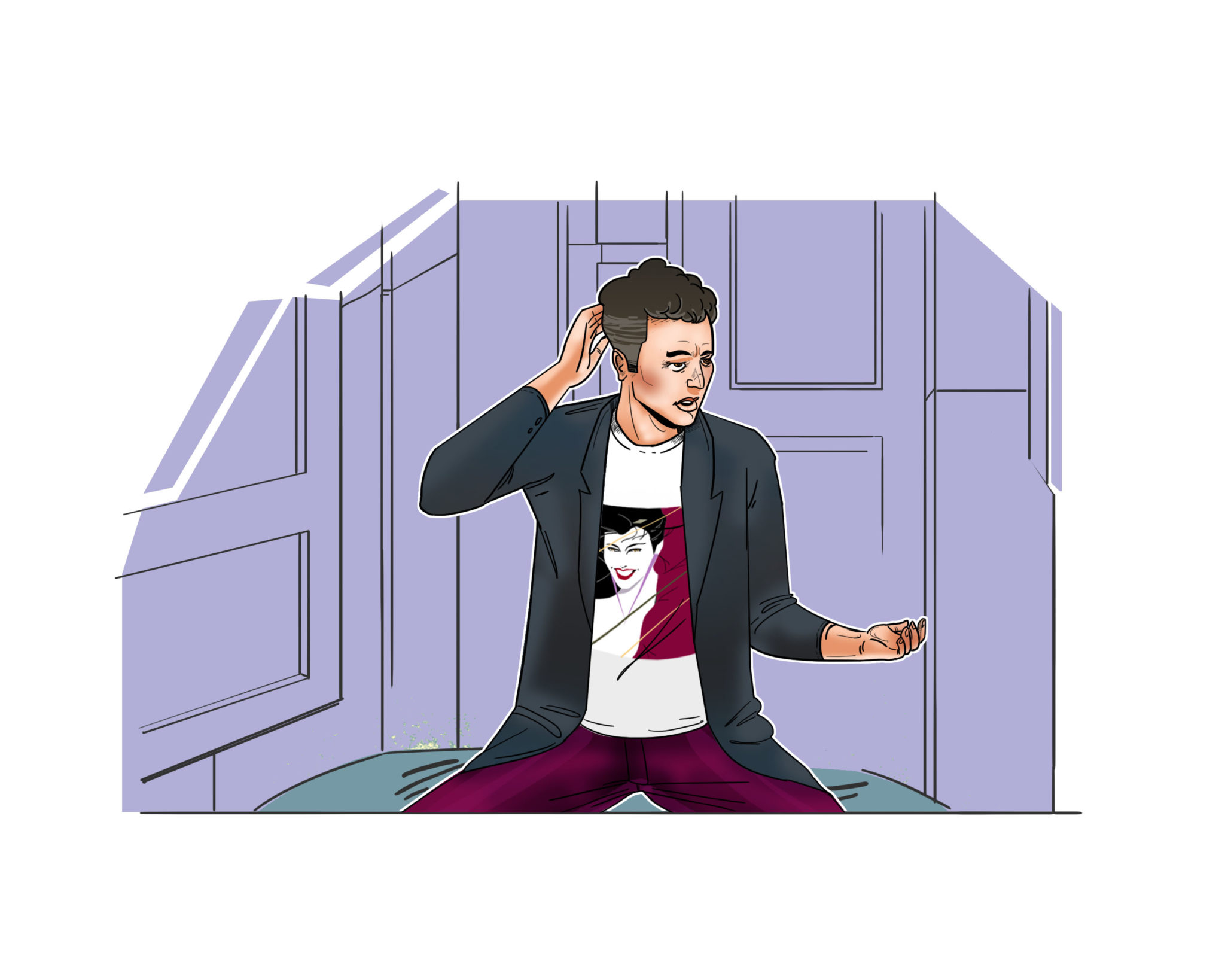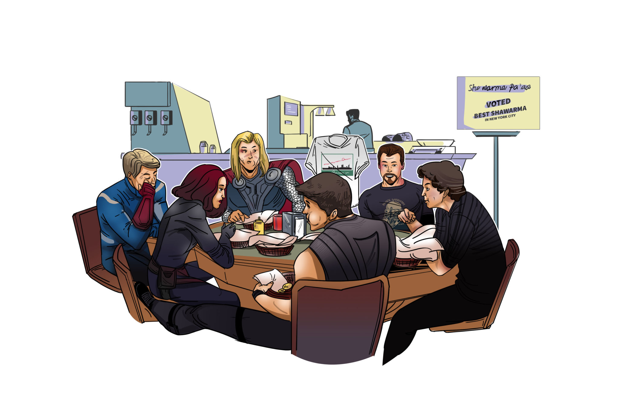 It would be a shame to leave it out since it was the punchline of Tony’s plan to eat shawarmas after defeating Loki and his borrowed Chitauri Army. (If anyone reading this has a high-quality picture of this shirt, please, please share it and we will update this drawing!)
