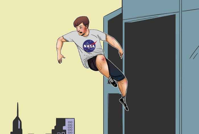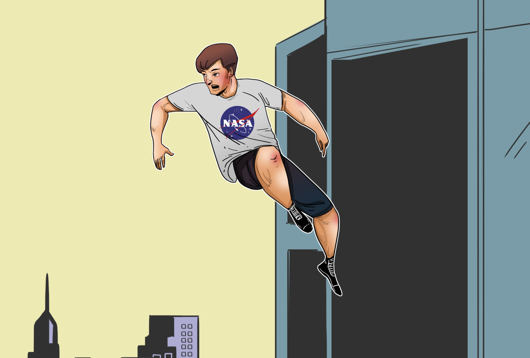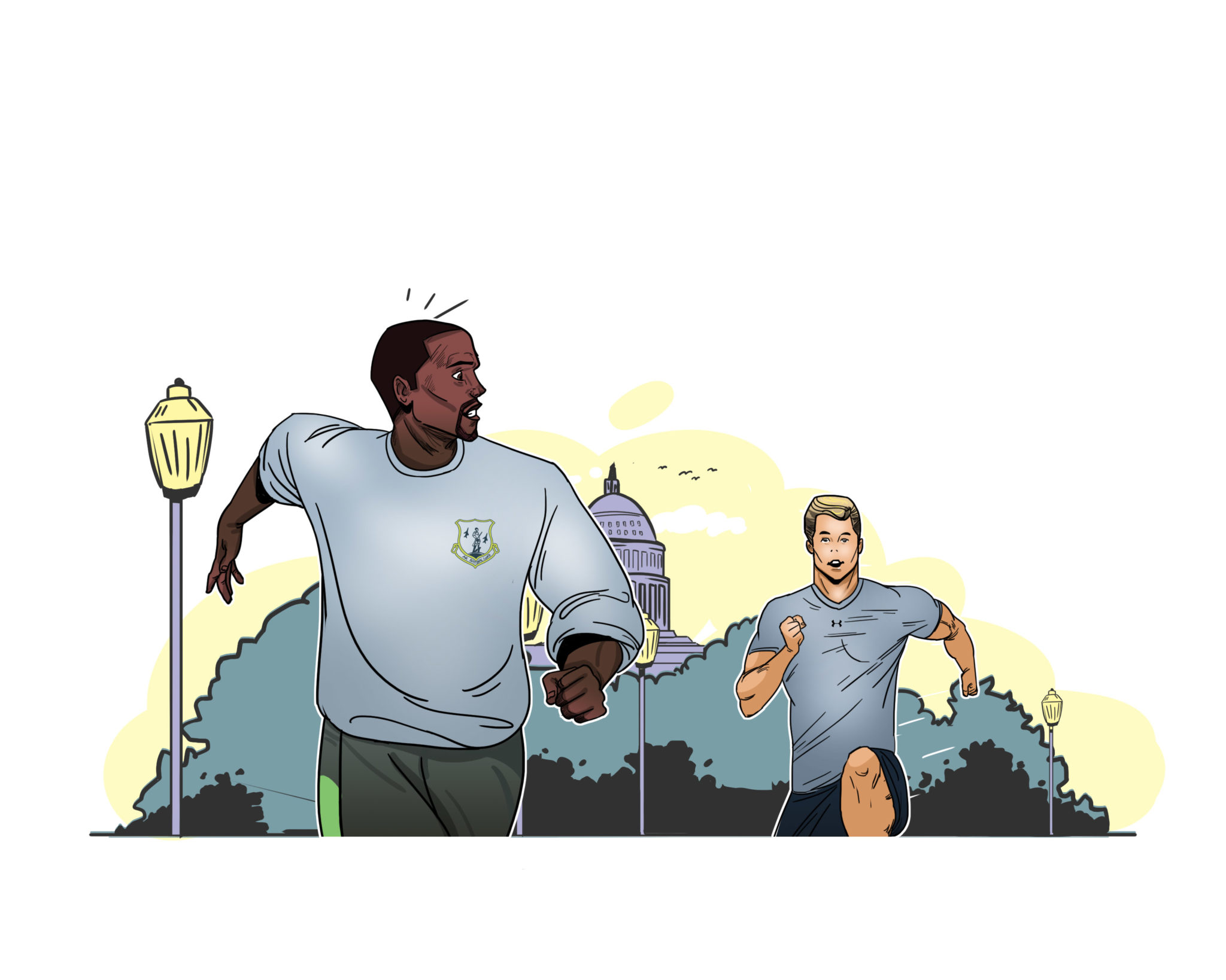 In this scene, Sam Wilson, aka Falcon, and Captain America meet for the first time while jogging around the National Mall. Falcon becomes exasperated as Rogers calls out, “On your left!” while repeatedly lapping the winded pilot. Without his wings, Falcon is an ordinary man. This makes Wilson no match for the biologically augmented Rogers.