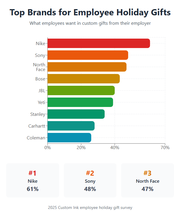 At Custom Ink, we know gifts that build connection mean everything. That’s one of the takeaways from our new 2025 Custom Ink Employee Holiday Gift Survey, which reveals what employees really want for their company gift (and what they definitely do not).