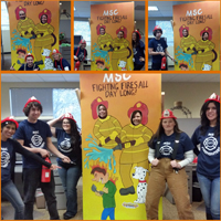 These colleagues work in a Credit Union call center. They see themselves as first responders, always having to put out fires, so for Halloween they dressed up as firefighters. They had a mural made with face cut outs for photo taking opportunities throughout the day. The group had a blast and looked great while doing it!