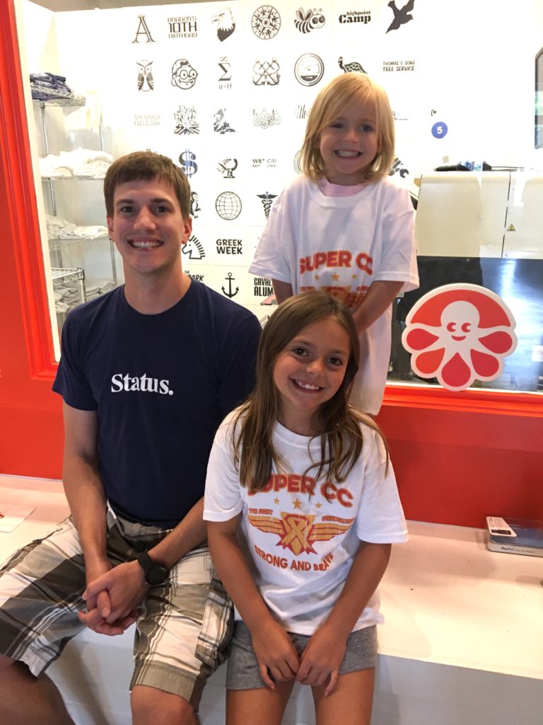 In 2018, the CureSearch event came around again, and this time, Emily had even more time to prepare. While her last custom t-shirts had performed well, she knew she could make something even more amazing. “It was important to me that the shirts serve two functions. I wanted people to like the shirts enough that they not only make a one-time donation to our cause by purchasing a shirt, but they actually wear the shirts frequently and continue to raise awareness of our cause for years to come. This meant the shirt had to not only look cool but feel great too.” So Emily took CC and her older sister, Big Sis, to the Custom Ink store near their home in Charlottesville to create something worthy of her daughter’s incredible spirit, and there they were met with some powerful allies.