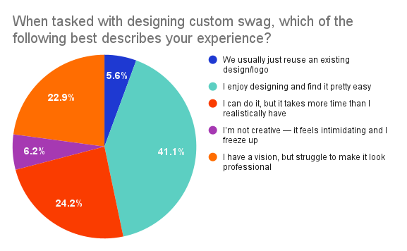 Only 41% feel confident designing from scratch. The majority either lack time (24%) or struggle to execute their vision (23%). That’s 47% of swag organizers who could use a helping hand but may not know where to find it.