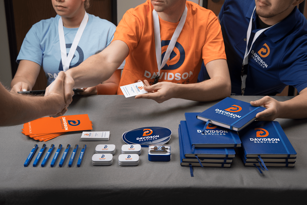 Your team members become walking billboards when they wear branded apparel. More importantly, matching shirts help attendees identify who works your booth, creating a professional impression and making it easy for prospects to approach the right people. We recommend coordinated custom polos or custom t-shirts for all staff members.