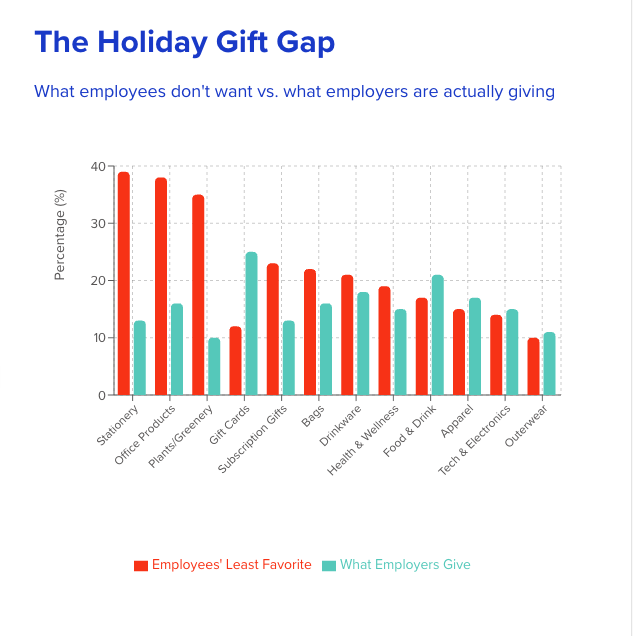 ![]() | Stationery: 39% Swap in: Electronics Stationery, like notebooks, sticky notes, and planners, can be super useful in the office and are welcomed by employees day to day. But for holiday gifting, employees often would like something they can enjoy both in and out of the office. They told us that they love tech that makes their lives easier. Chargers, ear buds, and speakers are the gifts that get used daily — powering through Zoom calls, crushing workouts, or simply making the everyday grind a little smoother. |