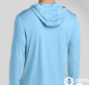 Shown on the Sport-Tek UPF 50 Hooded Long Sleeve Performance Shirt in Light Blue Try it on more styles and colors
