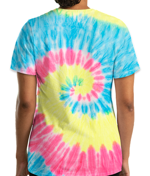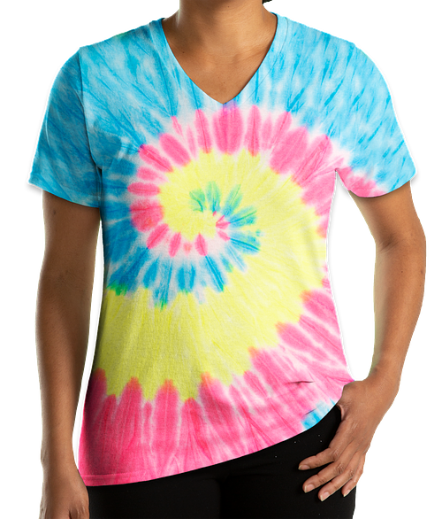 Shown on the Port & Company Women's Tie-Dye V-Neck T-shirt in Neon Rainbow Try it on more styles and colors