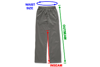 OUTSEAM: Measure along the outer edge of the garment. Start at the top of the waistband and end at the bottom hem.