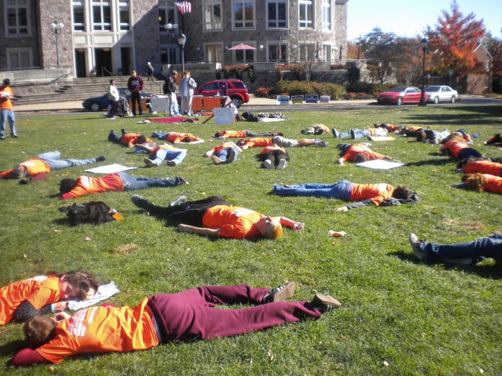"We held a die-in on Lafayette College's quad on 11/2/10 to protest the death penalty. Students lay down on the quad wearing shirts saying Victim #1201 to symbolize the over 1200 people that have died from the death penalty."