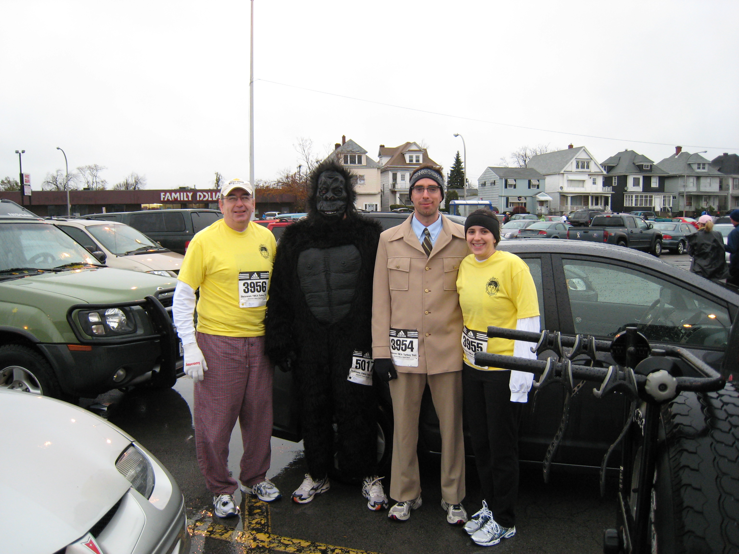 "My mom passed away this summer and so my dad and I decided to run this race in honor of her. We had t-shirts designed in her favorite color with her life motto "Never Give Up" on the back and a small image of her on the front pocket with the words "Mom, Sister, Daughter, Wife, Grandmother" encircling the image. The t-shirts came out great. As you can see, my brother and his friend also had "unique" running outfits."