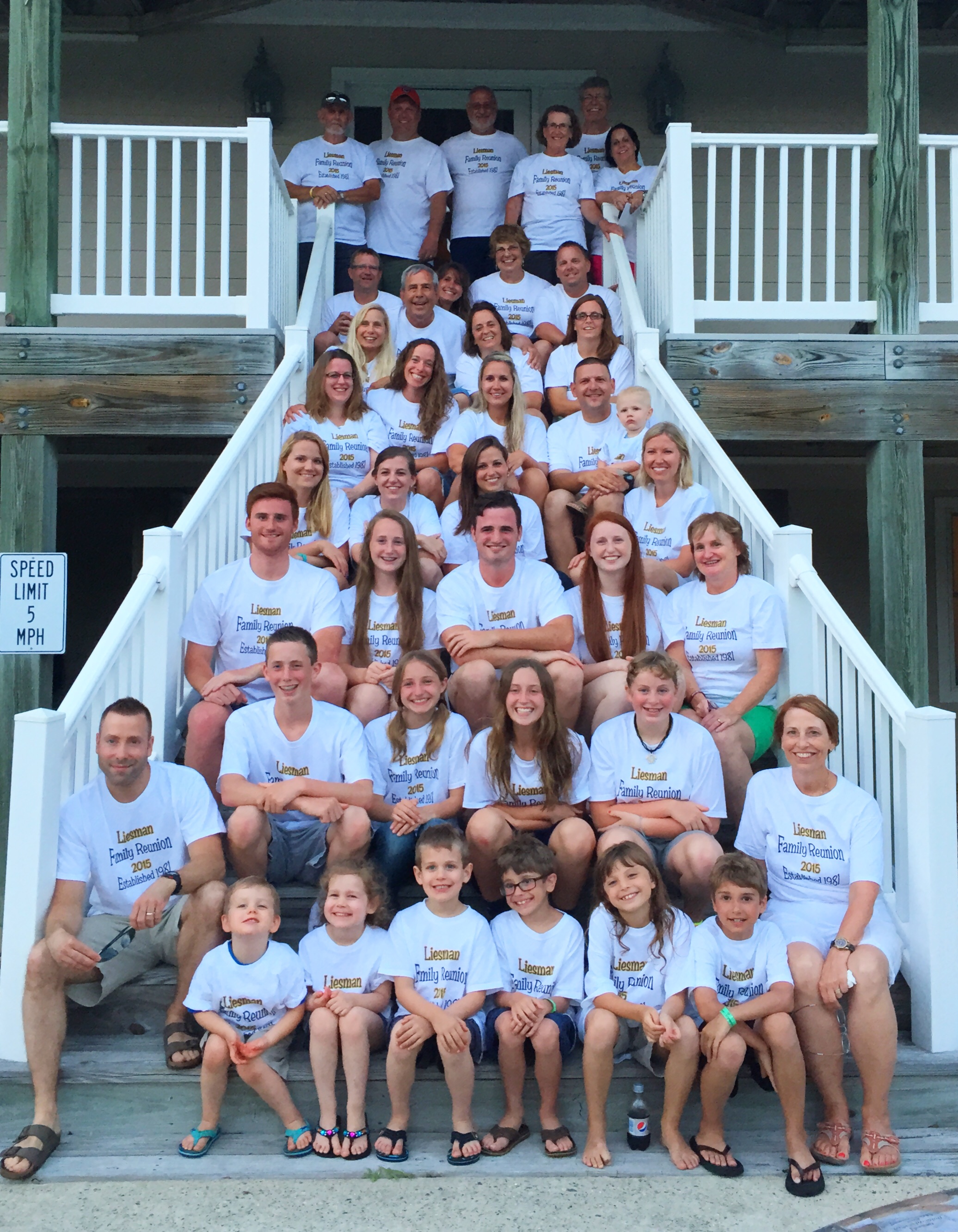 "We began our family reunions in 1981, we get together every two years for a week. We have been many places in the United States including NJ, WI, MO, MI, SC, NC, RI, NY, and NH. This year, I created this shirt in honor of my Mom & Dad's living legacy: six children, sixteen great grands, and 13 great-grands (and still counting). This picture was taken on July 16 in Corolla, NC and shows 41 of the 47 members of Bill & Helen's living legacy. My experience with Custom Ink has been wonderful, from the use of your design tools, through review, printing, and delivery. Our family enjoyed wearing the shirts and the will be used for many years to come!! I will definitely recommend Custom Ink to others!"
