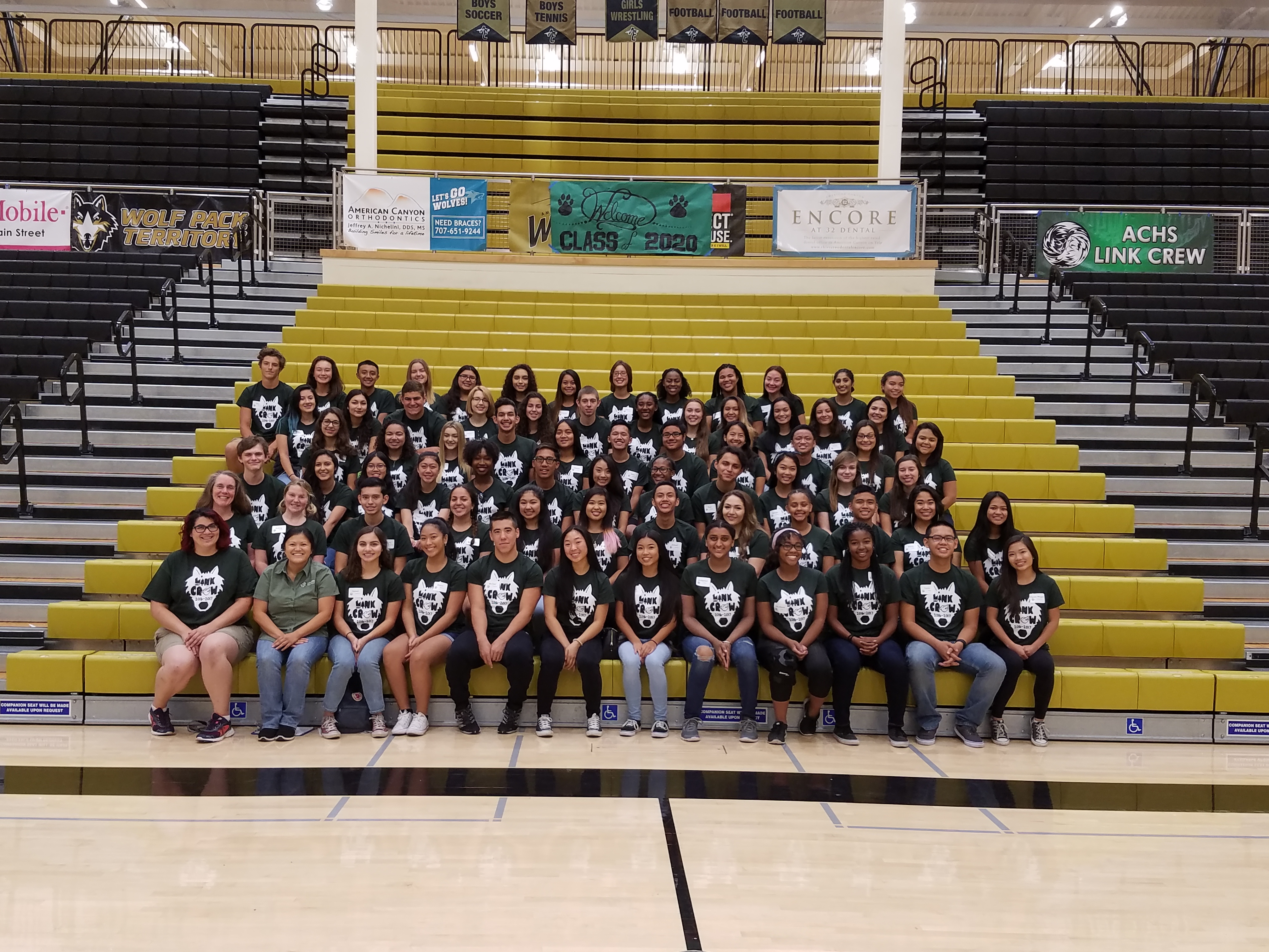 "This is a picture of American Canyon High School's Link Crew Leaders minutes before they welcome the Class of 2020 to their freshmen orientation in their new shirts!"