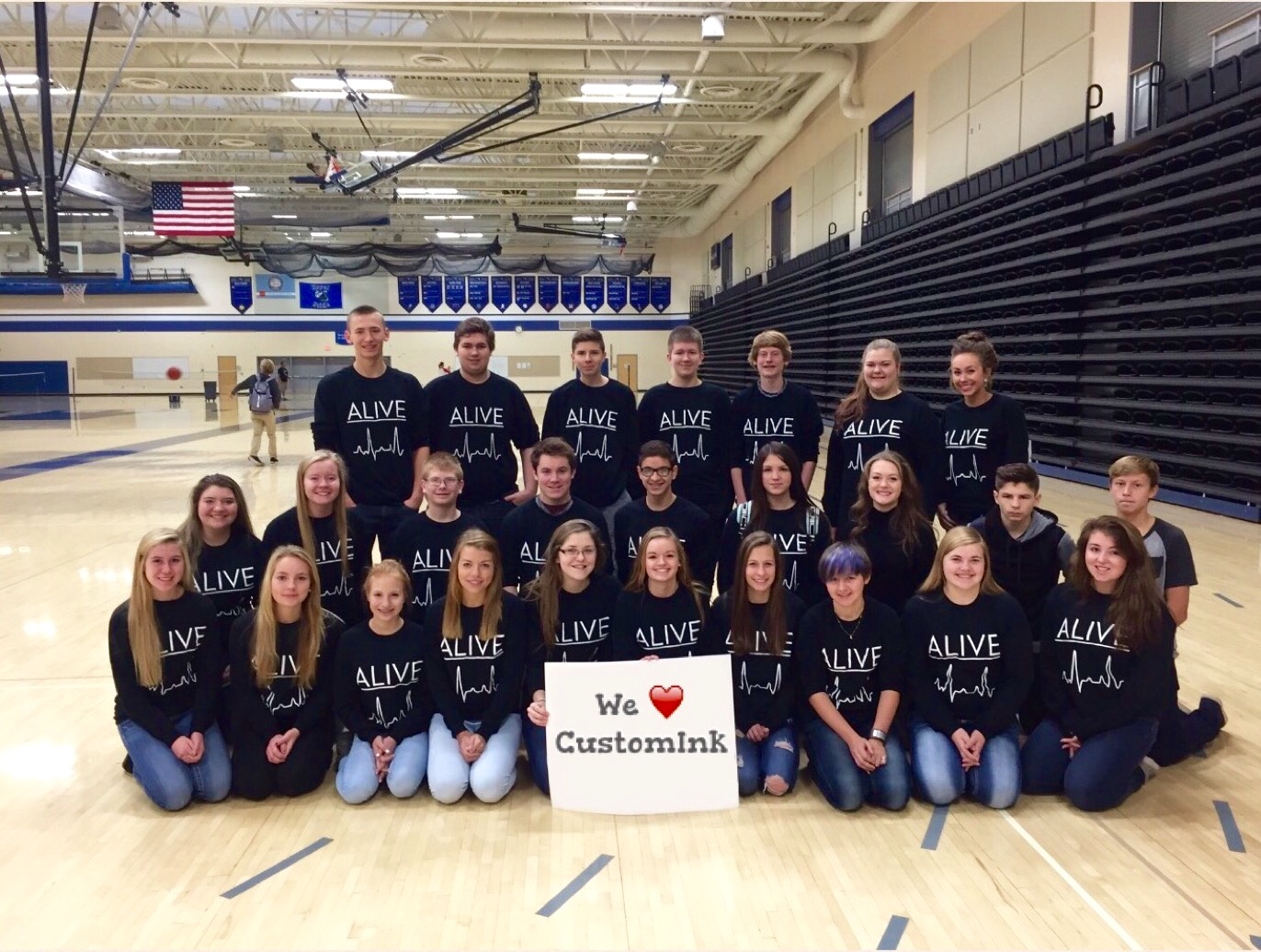 "The photo was taken at Rogers High School in MN. We have a morning bible study called Alive. We got the shirts to help advertise since our school won't let us. The shirts that we got have changed our school because people are finally knowing who we are. Thank you so much! CustomInk was so great to me and my order and the shirts got rave reviews. If I ever need more shirts I wouldn't hesitate to order wth you guys again! "