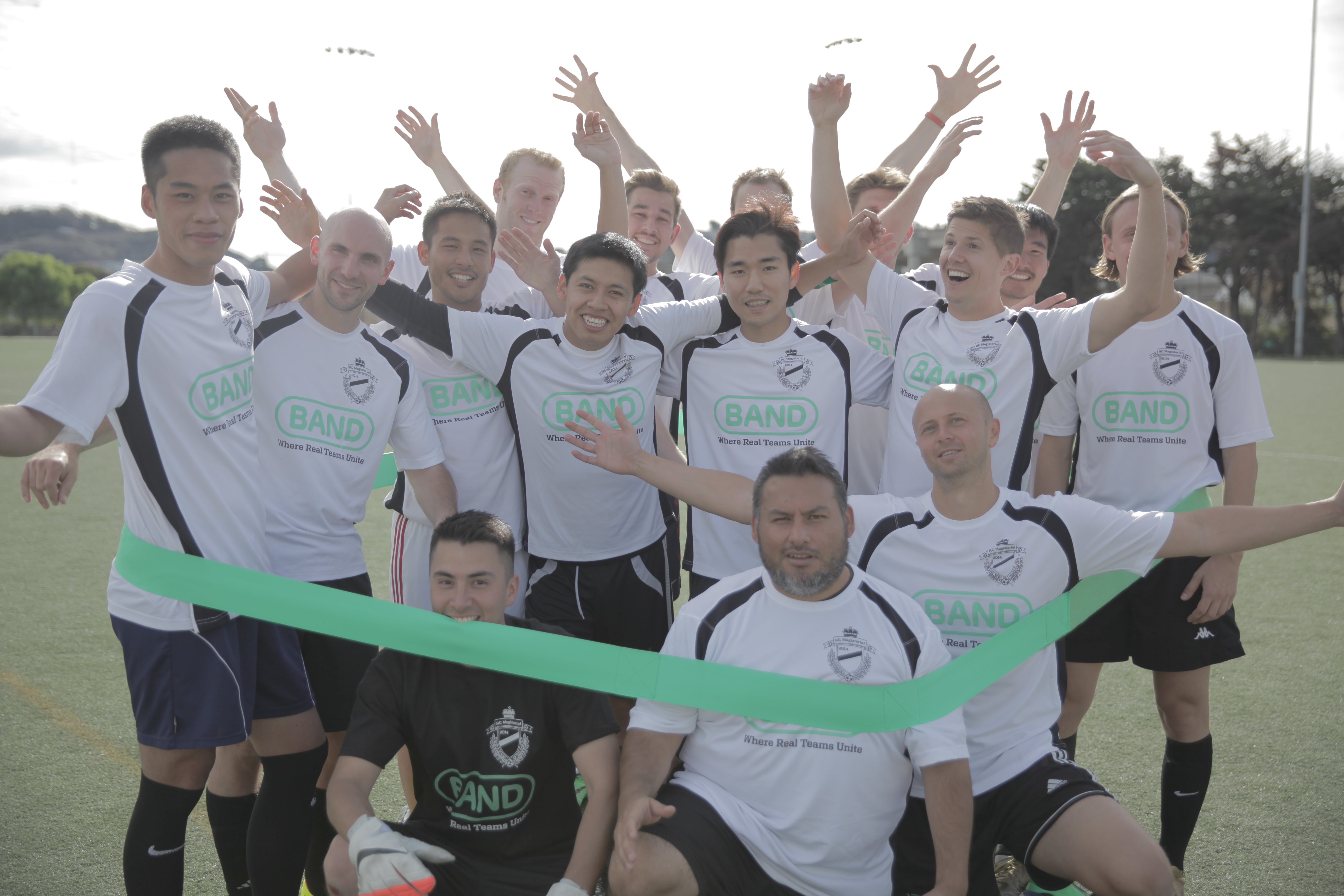 "BAND, a private group communication app, sponsored soccer jerseys to the SF-based soccer team, AC magisterial. They, heavy users of our product, recently requested us to sponsor the T-shirts in order to make a viral to other teams in intramural soccer league, Sports4good. BAND team met 16 players on this sunday(Nov. 23) on the Silver Terrace playground in SF and delivered jerseys having BAND and their team logo printed on.
