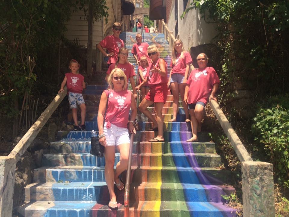 "This photo was taken in Eureka Springs, Arkansas last Saturday. We had our first family reunion in 14 years with 40 people in attendance. This group went from the resort in to town for some shopping and took this pic on these cool steps. Working with Custom Ink was a great experience in everything from the people, the website and the prices - we will definitely order again for our next reunion which will be much sooner than 14 years!"