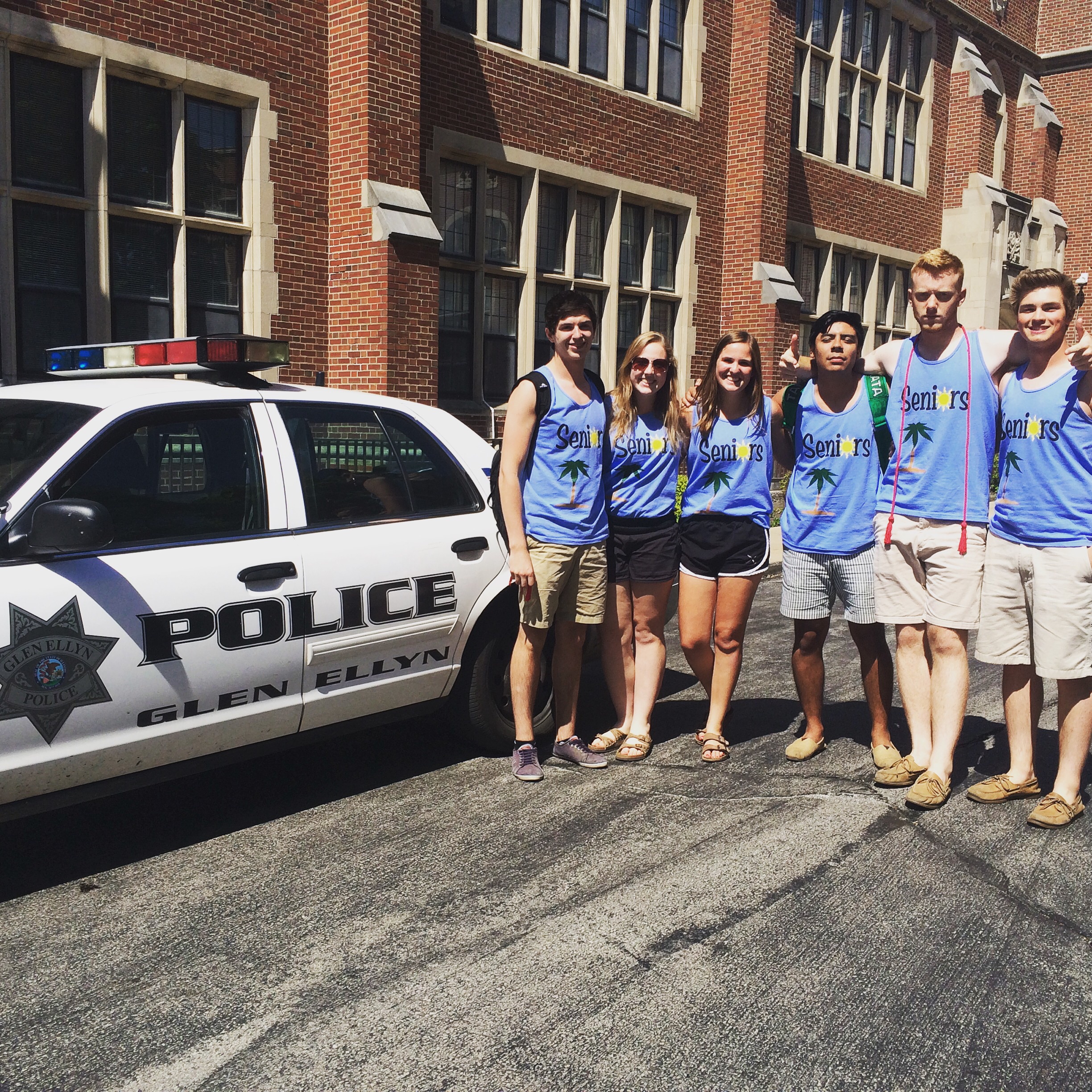 "Our shirts were made for a theme day that all the seniors in our high school participate in. You grab a group of friends and design a shirt. Usually the shirts have a funny underlying message about being a senior. The picture was taken by the front doors of the school next to a police car that happened to be there (the boys thought that was funny). CustomInk was great to work with and I always new where our tanks were in the process of being made. They always show up right in time!"