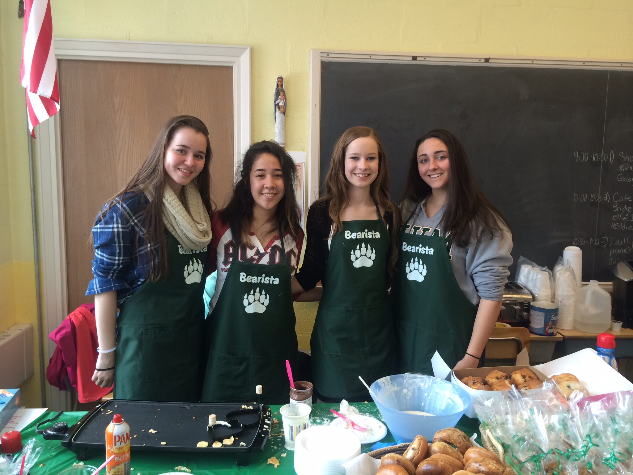 "These "bearista" aprons were worn by the Ursuline Academy Bears during Mission Day 2015. Mission Day is a unique and festive time at our school when each homeroom is transformed into a store, booth or restaurant. Everything sold in these rooms is donated by members of the community. Throughout the day, the money spent purchasing the foods, raffle tickets, bear stuffed animals and more is all donated to charity. One room was the Bearbucks cafe this year and these "bearista" aprons certainly sold us a lot of coffee! With this cute design from CustomInk, the donations of many and the spirit of Ursuline, we were able to donate over $19,000 to be equally divided between our two charities. This was an amazing accomplishment as we are a small school with only 400 students grades 7-12. One charity was local to us, Camp Harbourview in Boston which provides at-risk kids with a safe and fun camp opportunity. The next charity was the Tanzania School Fund which helps many children in Tanzania receive a proper education, nutritious meals and much, much more. The entire Ursuline community was incredibly proud to serve in this way and we wanted to thank CustomInk for the adorable aprons! "