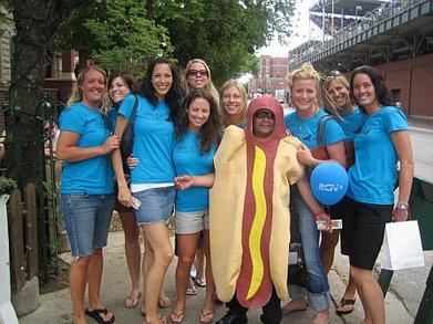 "I used my birthday as an excuse to go on a bar crawl through Wrigleyville during a Cubs game. The guy in the hotdog costume was a huge fan of our shirts!"
