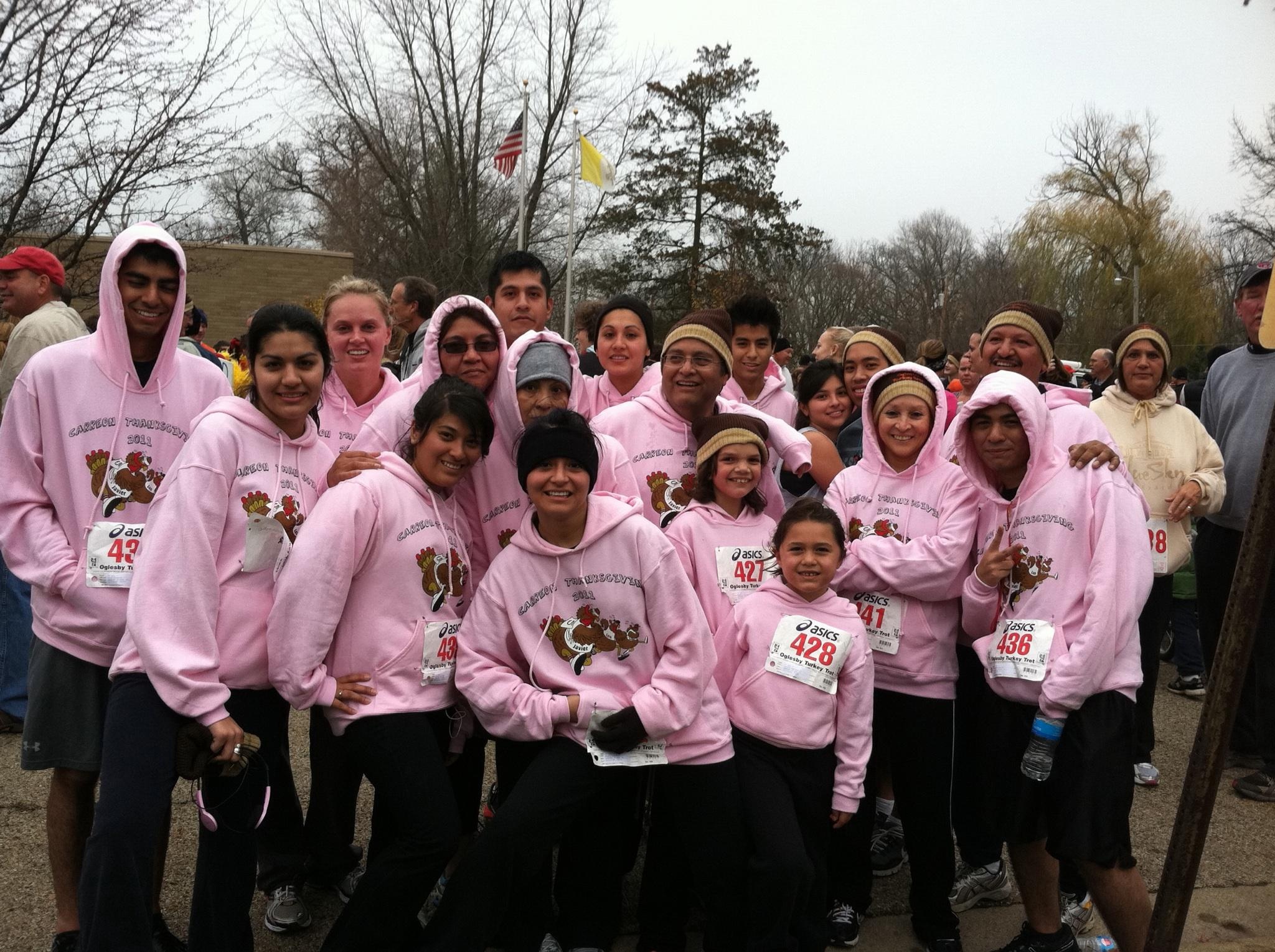 "For the last 11 years every Thanksgiving morning me and my family wake up and participate in a 3 mile Turkey Trot in Oglesby, Illinois. It originally started with only 4 participants and now includes 18-20 family members including nieces, nephews and siblings. The last 2 years we have had customized shirts/ sweatshirts by custom Ink and have been able to show off our family spirit! It has definitely made quite an impression on other runners.