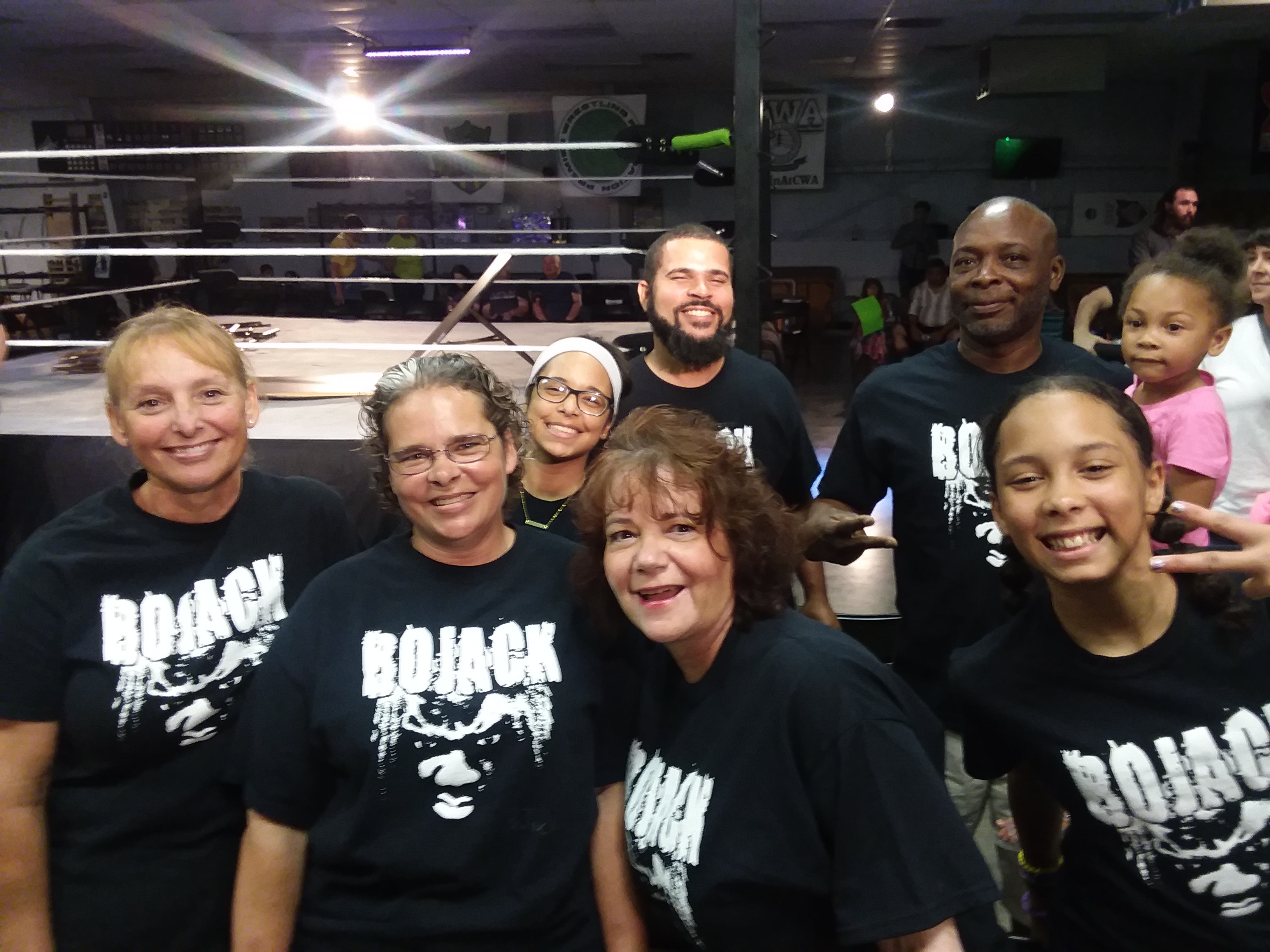 "We wore these shirts to a Wrestling Event where BoJack was wrestling in the Premier Wrestling Federation's (PWF) Unsanctioned Main Event of the night on June 22, 2018 at Hashimoto Hall in Hubert NC. Bojack smashed his opponent through a table which is still visible in the wrestling ring in the background of the picture. PWF holds events approximately once a month featuring new and professional wrestlers. These shirts from Custom Ink were exactly what BoJack designed and were delivered earlier than we were originally told would be the delivery date. Everyone loved the shirts and we had more people asking where they could get one. We will definitely order from Custom Ink in the furture!"