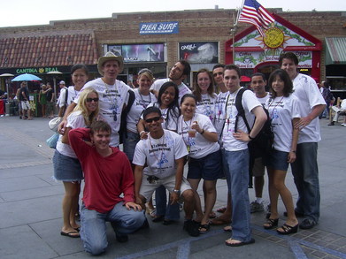 "This was my birthday party in Hermosa Beach California. I am the one with the straw hat on, there were eventually 30 of us wearing these great shirts!"