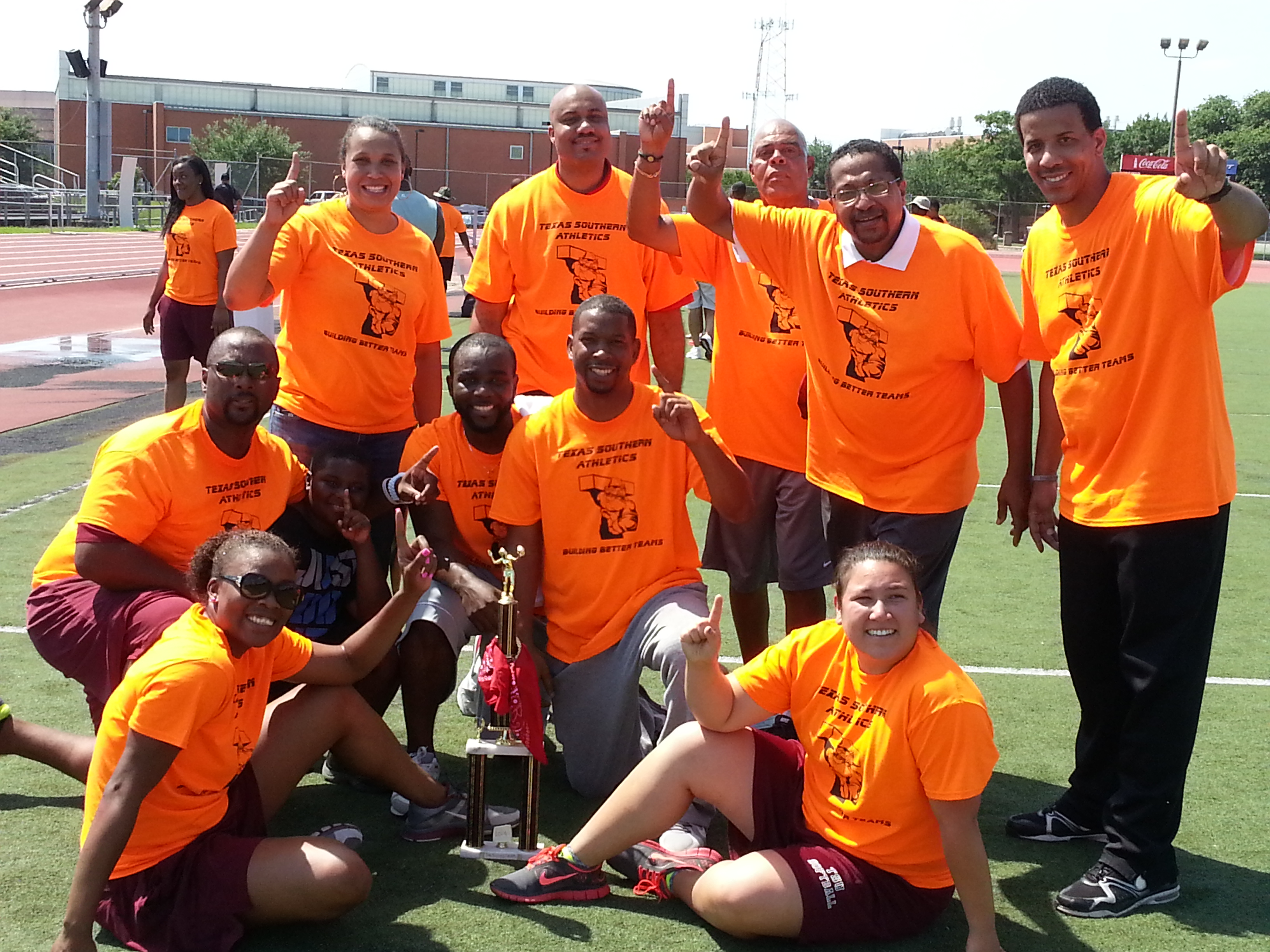 "Each year we have a team builiding competition. We break the entire athletics department (50 people) into 3 teams Red, White and Blue. We are all coaches, administrators and staff but we are super competitive. The RED team has won the event for the past 2 years and yep you guessed it. The team pictured is the RED team- 2014 TSU Athletics Department Team Building Champions."