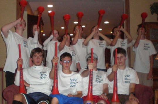 "This is the trumpet section for my high school marching band. We decided to do something special for just our section, and we decided to get vuvuzelas (we codenamed them Captain Crunch so we could keep it a secret!). We wore our brass shirts that we got from CustomInk to make the surprise even more special! "
