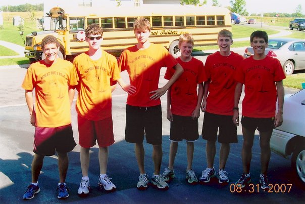 "In cross country we have a week were we have 3 different games/races, watermelon run, color cone run, and poker run, and our team won them 2 years in a row so in this picture our team is wearing our Repeat the 3-peat shirts!"