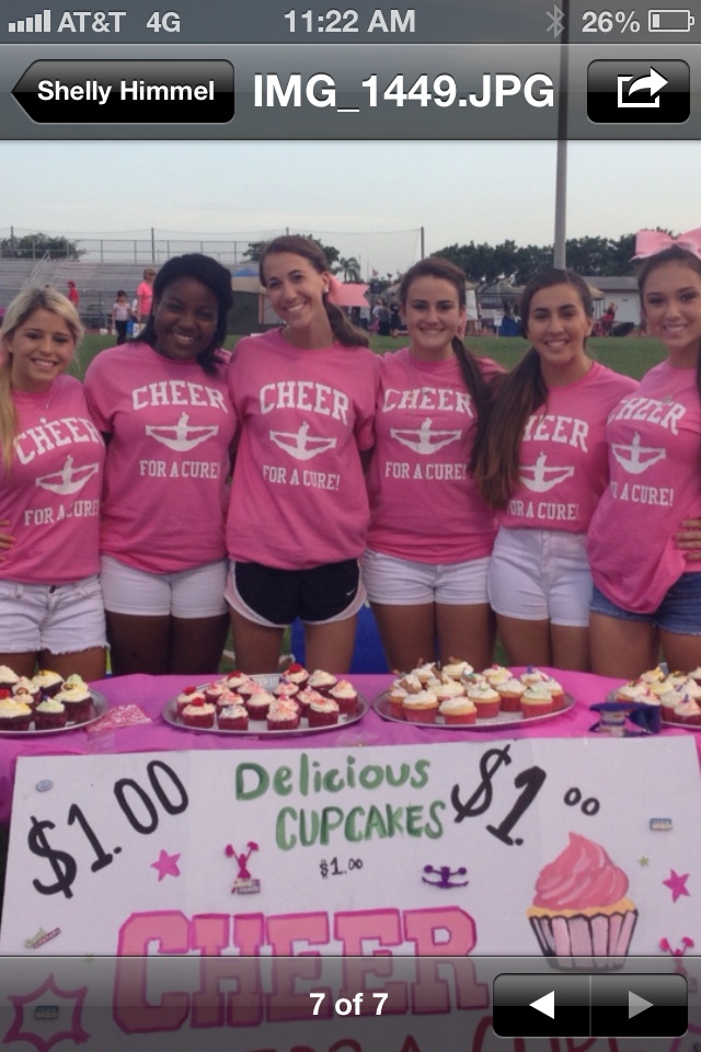 "Cheer For A Cure is a team of 6 High School Girls at MSD in Parkland, Florida. Marissa Gavin a junior asked the five girls to join the team for Relay for Life. This is for the American Cancer Society. They baked 80 cupcakes and decorated them. Everyone of the cupcakes sold!