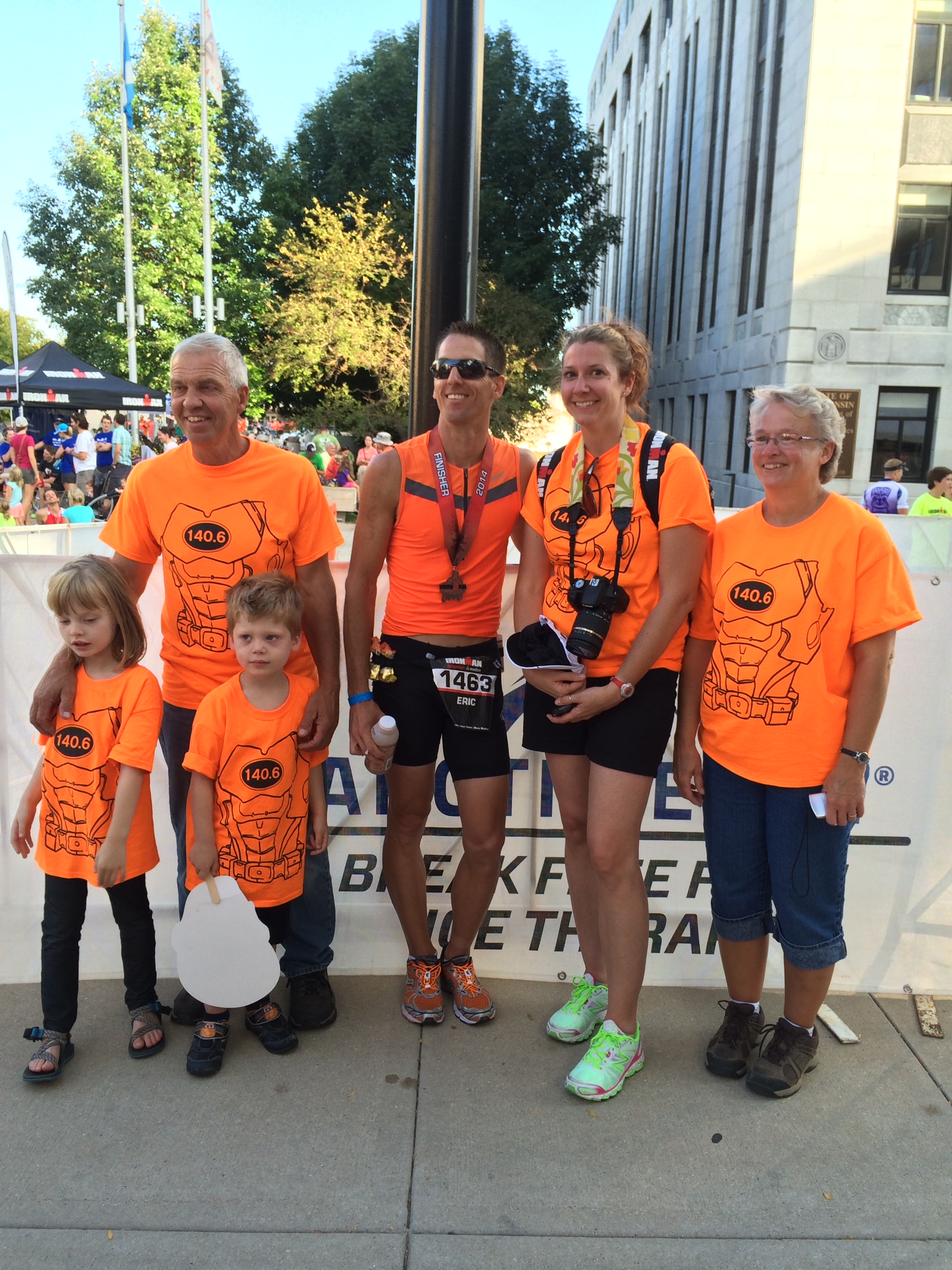 "My husband did his first Ironman race on September 7, 2014. I made the t-shirts for his race and used CustomInk. This photo is his parents, us, and our niece and nephew. Our nephew loves superheroes and was so excited that not only was his uncle going to be an Ironman, but that he got an Ironman-like tee as well. My experience with CI was phenomenal. The design was fantastic, the shirt color was perfect, the shipping was quick. Everyone loved the shirts. We'd definitely use it again! Thank yoU!"