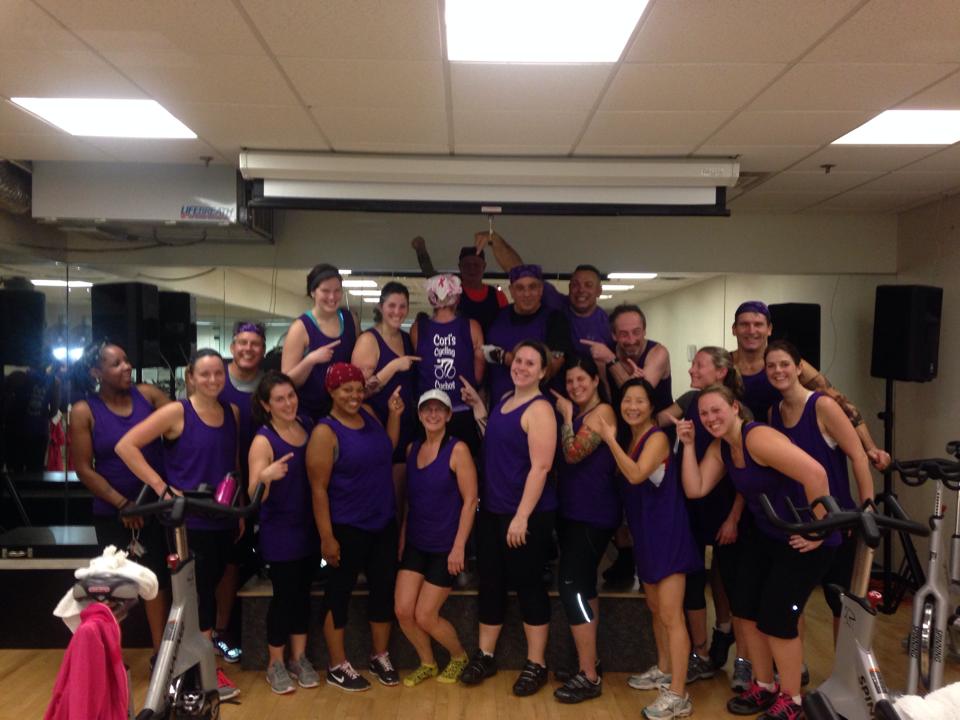 "We started an indoor cycling "gang" at my gym, that started with us wearing pink or purple bandannas as a show of support for a cancer survivor in our group and it just evolved into a full on press. The shirts were my way of giving back on my birthday to others. We will now wear them every week during our Tuesday night ride :)"