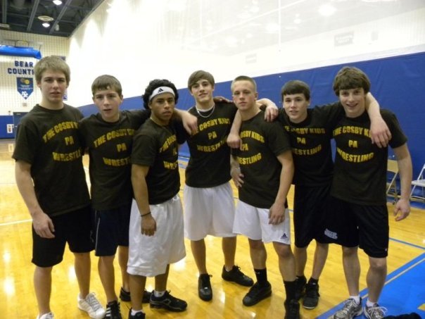 "This is the Cosby Kid wrestling team entering a wiffle ball tournament. Truth is, a bunch of us wrestling ended up winning the tournament by beating the Varsity baseball team in the finals. Alot to do with that was our intimidating shirts that we were blessed with from the help of CustomInk. They are by far the best designing company around today!"