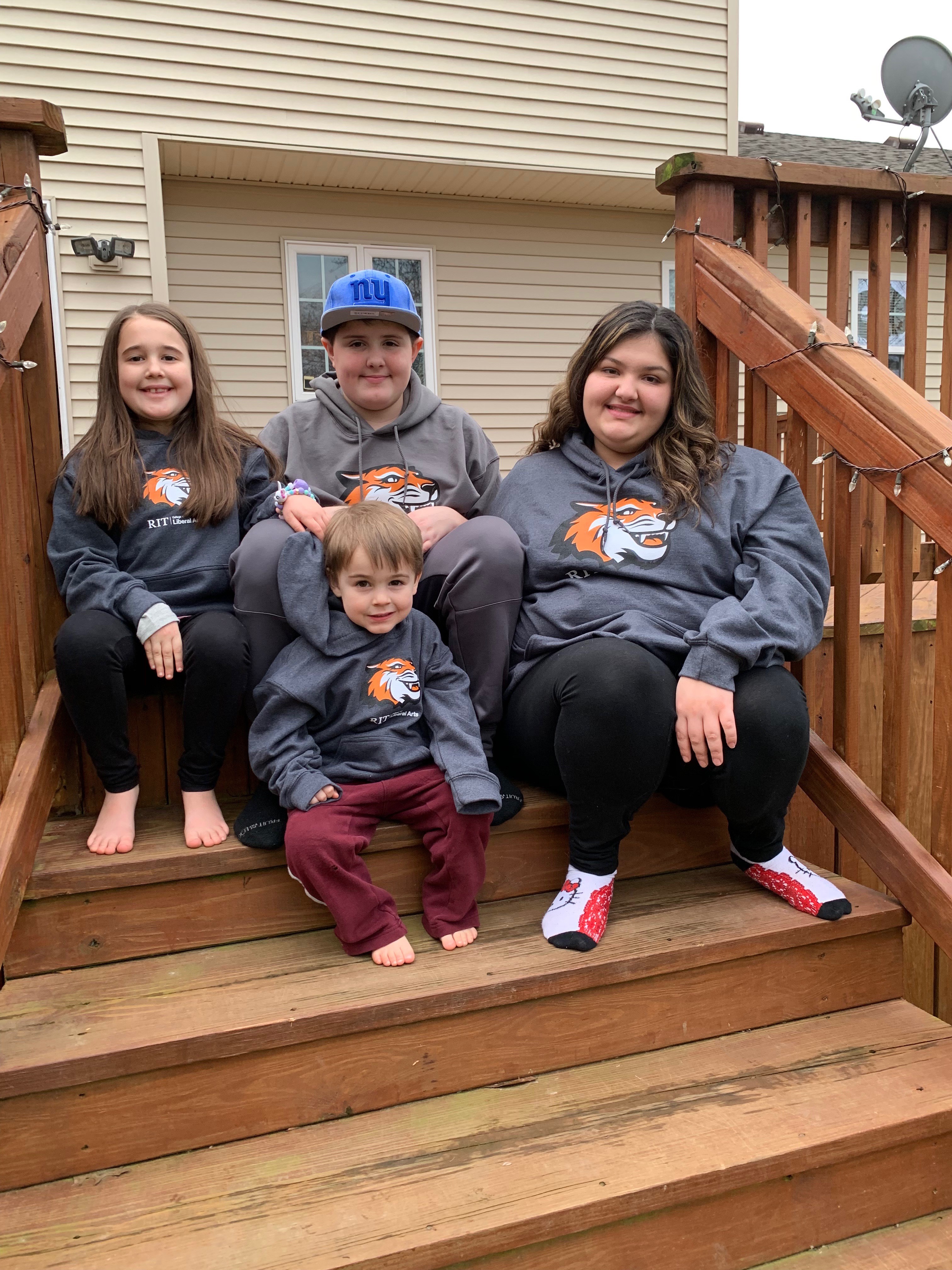 "I am the organizer of the order for the college I work for. Two of the kids in the photo are mine and the other two are my best friends children. I gave all the kids matching hoodies for Christmas. They loved them and didn't want to take them off!!! My experience with Custom Ink was beyond anything I expected. Everyone was so friendly and willing to help. We received our order right on time! Thank you Custom Ink!!!"