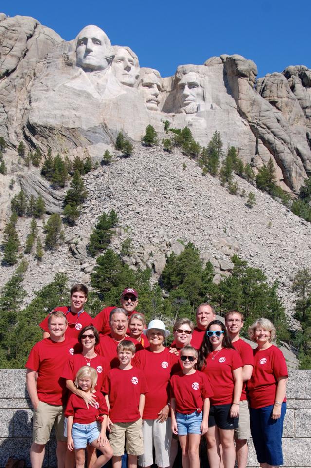 "My family (Mom, Dad, 3 siblings and spouses and all their kids) have taken a vacation every summer for 21 consecutive years. This year we ventured away from North Carolina all the way to South Dakota. You'll see the Crouch Crew just below the presidents! We had a great time. While we were taking this picture it was so funny - the crowd totally cleared out the plaza to allow us to get the picture. All thanks to our CustomInk shirts. "