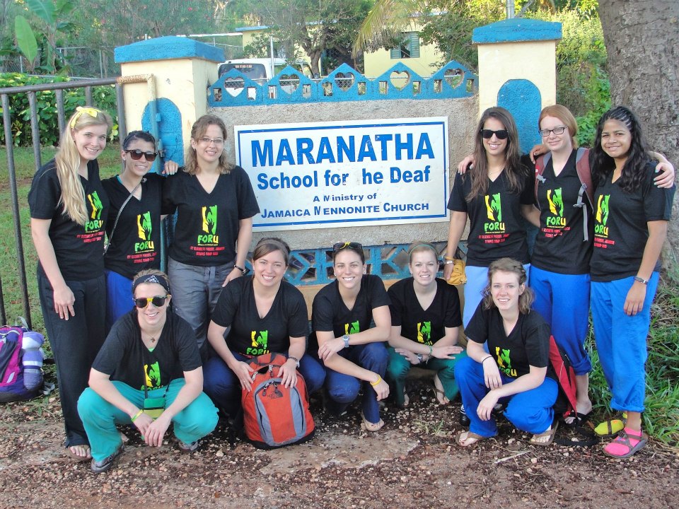 "A group of 10 physical therapy students from Duke and their professor travelled to Jamaica for a week in December to help treat patients recovering from stroke. Seen here is the team in front of a sign at the school for the deaf where they were staying in the St. Elizabeth parish. CustomInk was incredible to work with before the trip! They helped re-design the logo to make it Jamaican colors and have helped with a last minute order to bring to the physical therapists down there and another order that we gave to the patients who we treated. We hope to use CustomInk again to order these shirts for all of the patients being treated at the Friends of the Redeemer United Stroke Camp in Jamaica! We appreciate all of your great work, mon!"