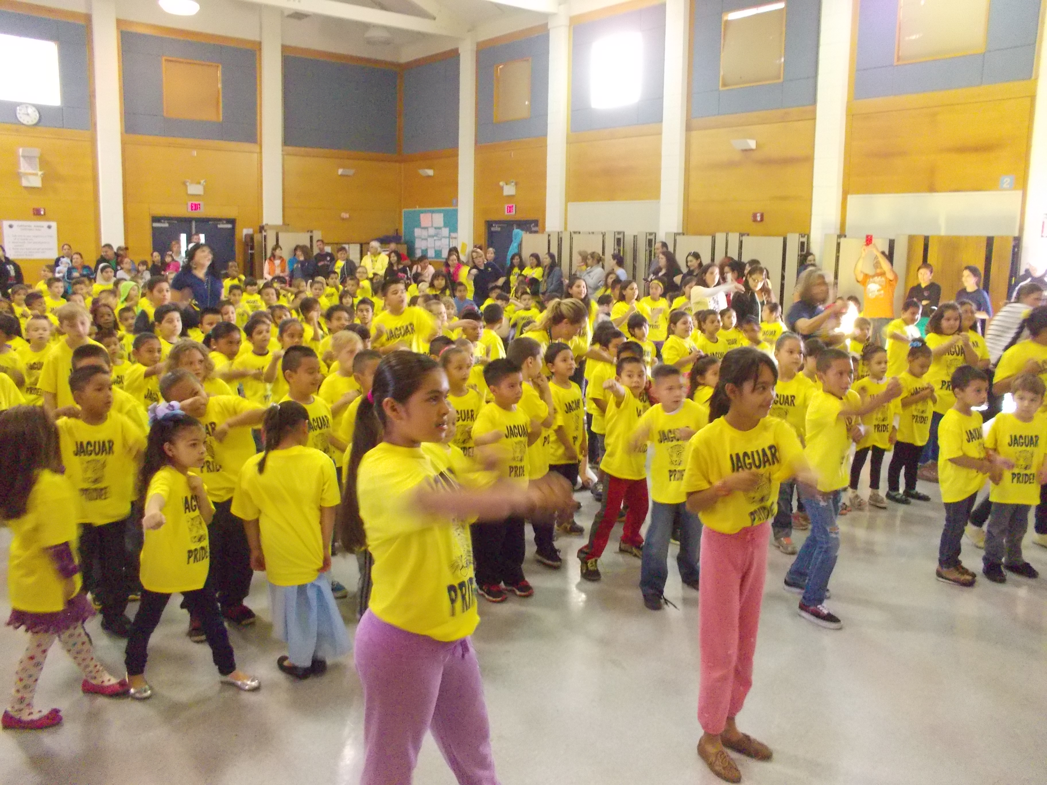 "During Red Ribbon week I purchased 628 shirts for every student in our school. For Friday of Red Ribbon we had a dance-a-thon and every student wore their custom ink shirt. Look at the "sea" of yellow! It was awesome! We had to do three groups because our cafeteria could not hold everyone at once. The good news, we made over $3,500 dollars and were able to pay the PTA back for purchasing the shirts ahead of time. GO Jaguars! Thanks CustomInk."