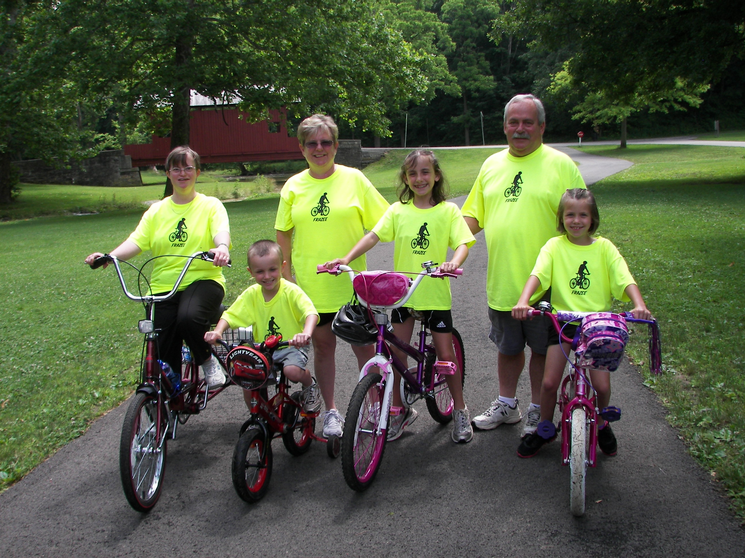 "In this picture is me and my husband, my daughter and three of my sons children. Several years ago we started taking the oldest to a park close to our house to teach her how to ride a bike. We had so much fun that we bought our daughter an adult trike, my husband got my sons bike out of storage and I bought a bike. As my grandchildren get older we add them to the fun. We also bought a small cargo trailer to haul the bikes in. The t-shirts help keep track of everyone. Working with Custom Ink was so easy and fast. thanks"