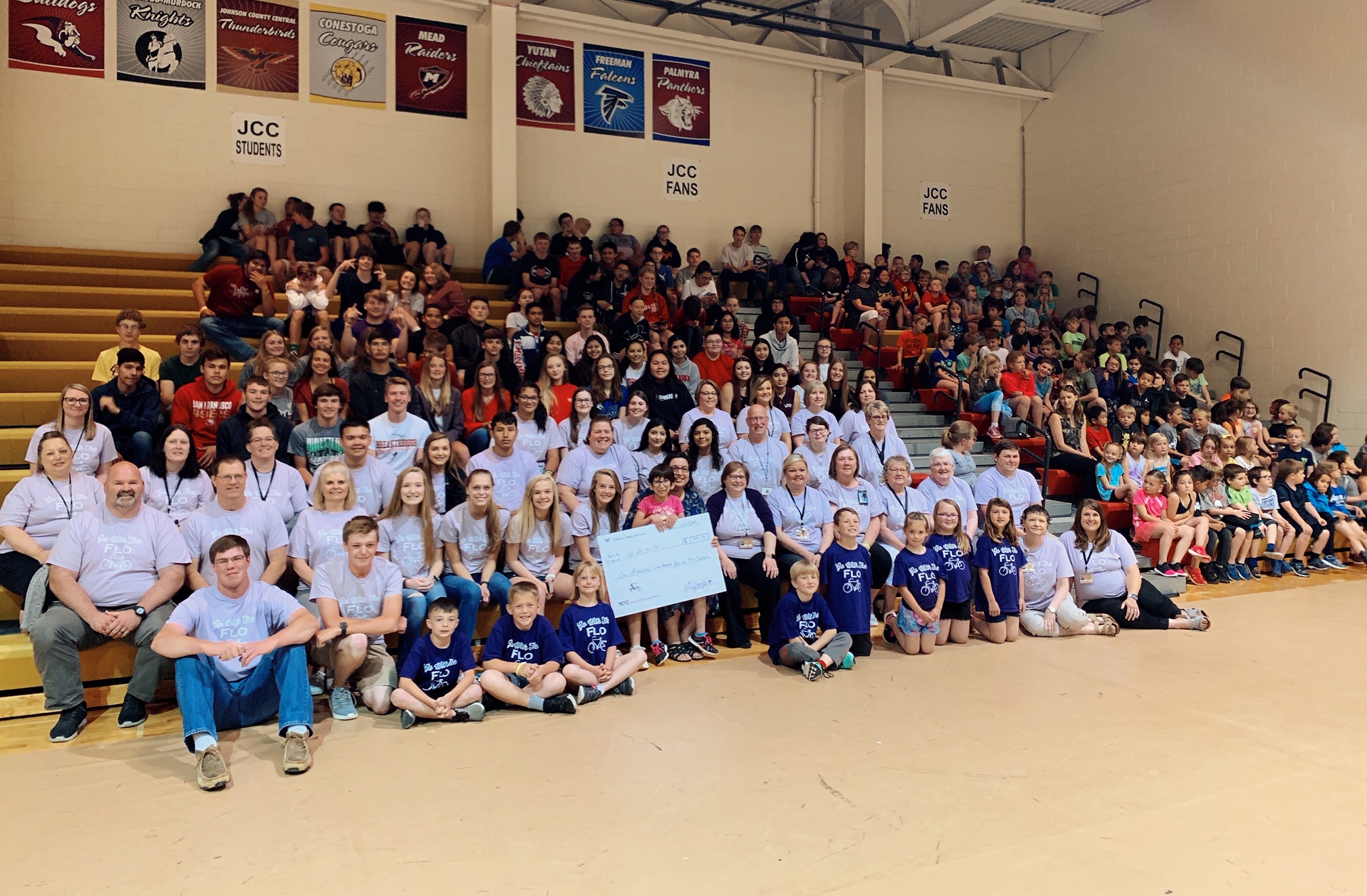 "Pictured here is Flo and all her supporters who purchased purple "Go with the Flo" shirts to raise money for Flo's custom bike fitted with adaptations for her specific needs. Special thanks to HOSA and all the folks at Custom Ink!"